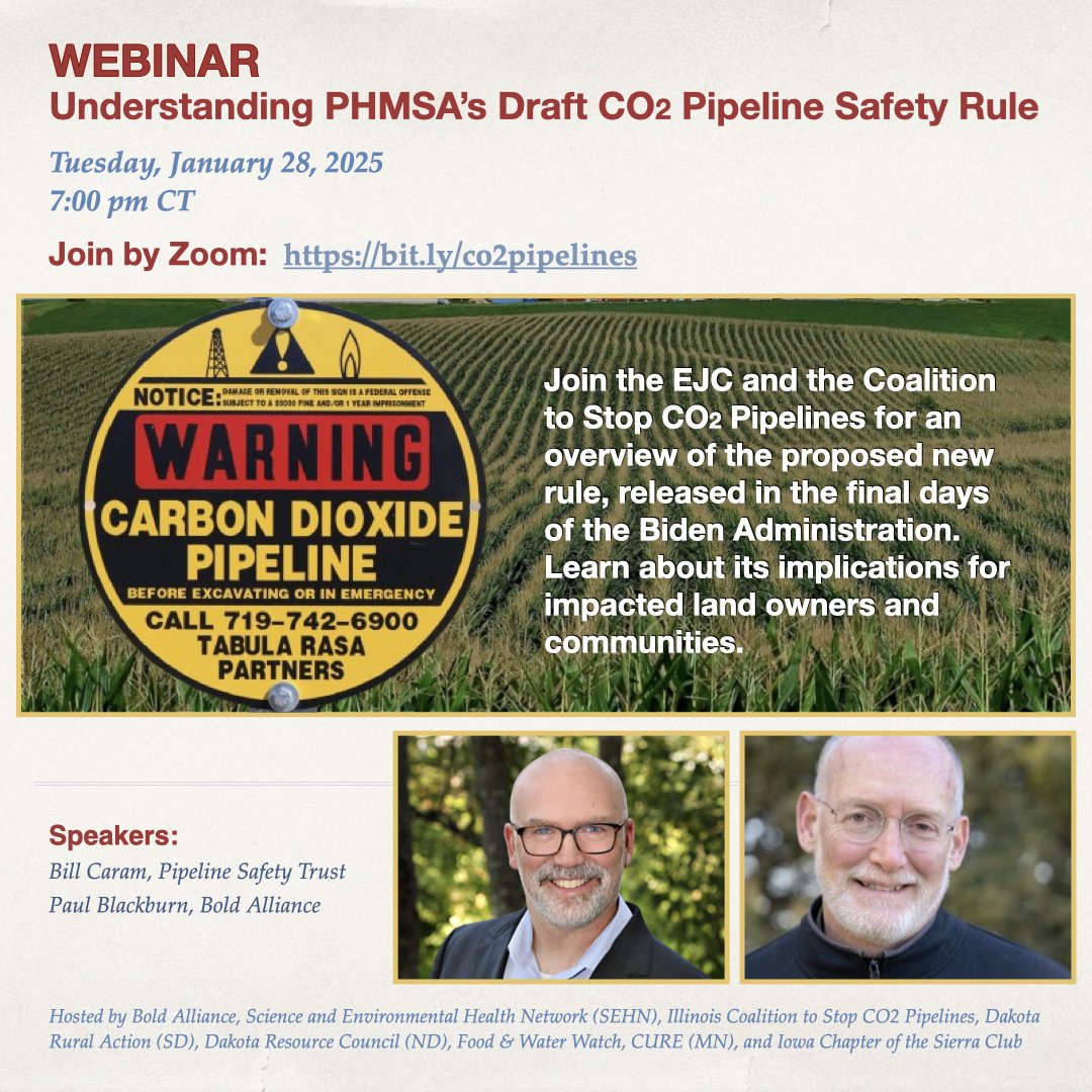 PHMSA's draft rule to increase safety and oversight of CO2 pipelines was issued in the final days of the Biden Administration, but now has been withdrawn by Trump. What could this mean for landowners affected by CO2 pipelines? Join this webinar on January 28 to learn more: bit.ly/co2pipelines.