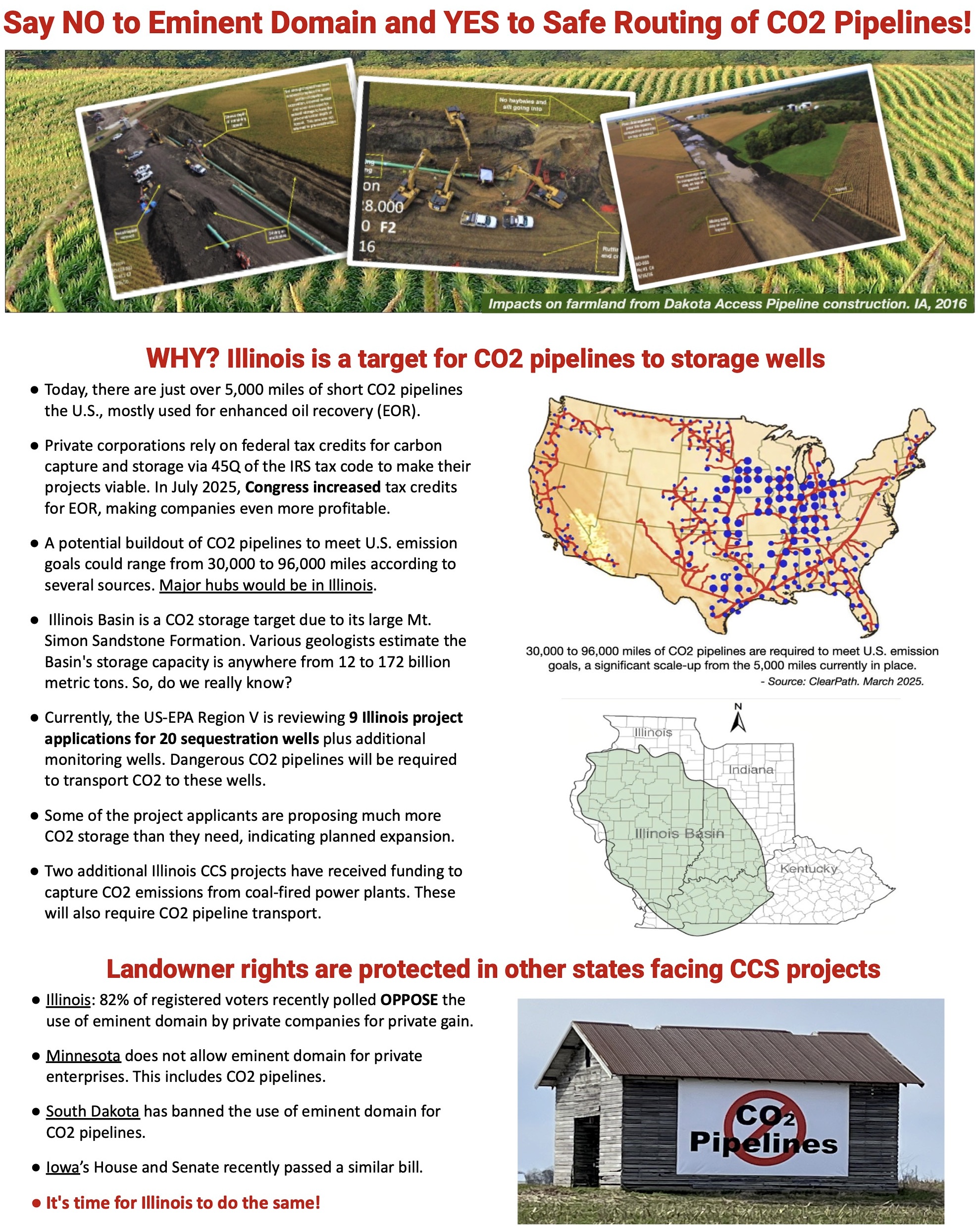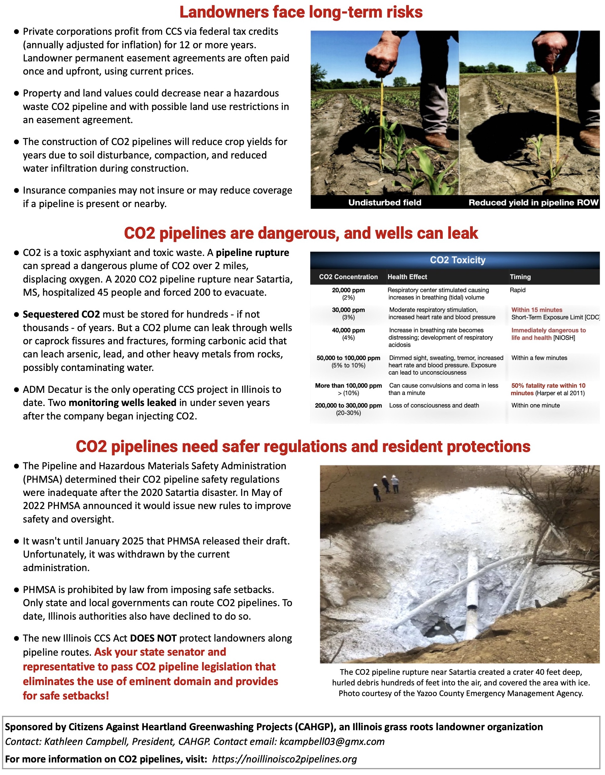 Citizens Against Heartland Greenway Project, member of the Coalition to Stop CO2 Pipelines, has launched a legislative campaign to end the use of eminent domain for CO2 pipeline projects in Illinois. This flyer explains the impacts CO2 pipelines have on farmland, health and safety, and property rights.