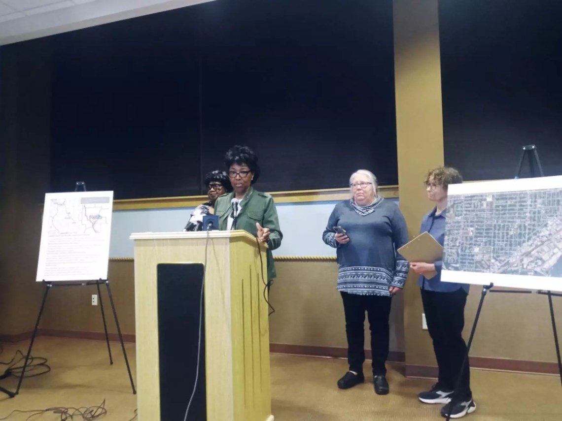 1st District Peoria City Council member Denise Jackson, at podium, speaks about her concerns with the proposed Wolf/ADM carbon capture pipeline during a March 30 news conference at the Peoria Public Library Lincoln Branch.